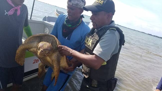 El Grupo de Protección al Turismo Nacional, en coordinación con unidades del Grupo de Protección Ambiental de la Policía en el departamento del Atlántico, rescataron a una tortuga carey de aproximadamente 65 kilos que estaba a punto de morir abandonada a orillas de las playas de Puerto Velero.
