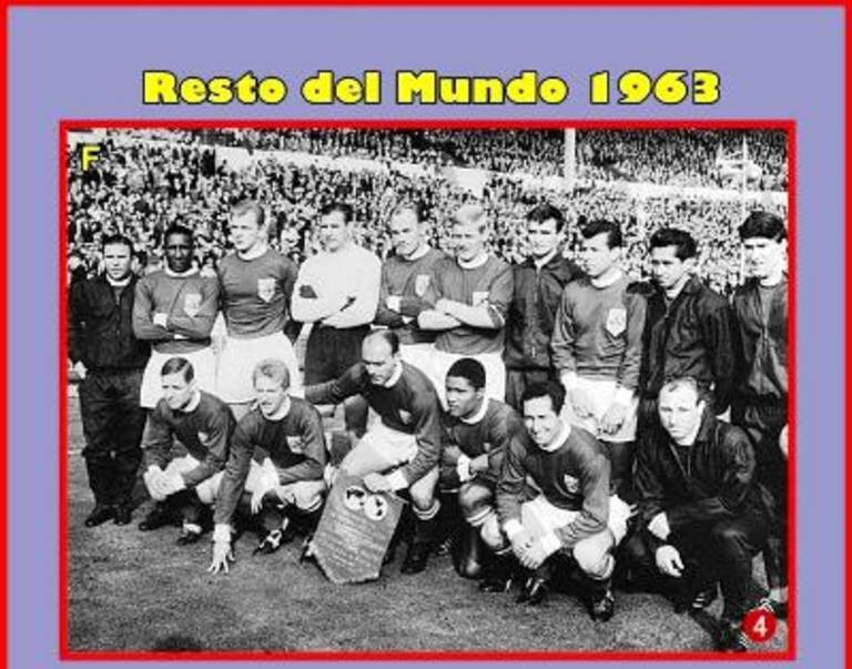 RESTO DEL MUNDO 1963DE PIE IZQ-DER: Puskas, D. Santos, Yashín, Novak, Schnelliger, Soskic, Masopust, Eyzaguirre y Baxter.ABAJO IZD-DER: Raymond Kopa, Denis Law, Di Stéfano, Eusebio, Francisco Gento y Wue Seeler.