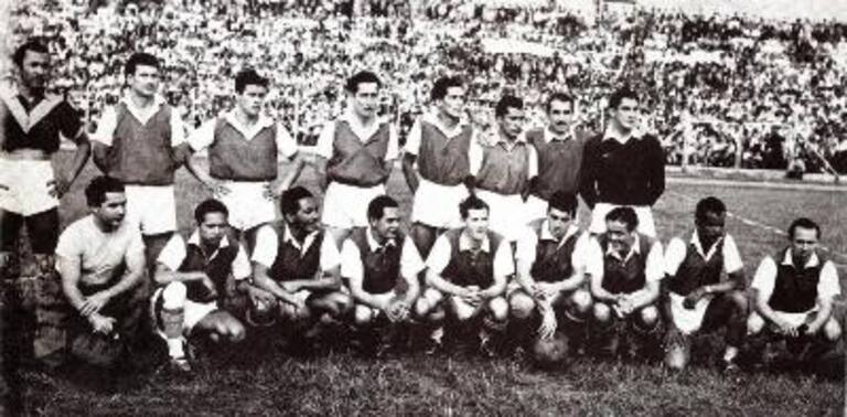 SELECCIÓN DE EXTRANJEROS 1952DE PIE IZD-DER: Tacheros Martínez, Atilio Miotti, Georgy Marik, Caimán’ Sánchez, ‘Ruso’ Sabransky, Pablo Centurión, ‘Toto’ Bernásconi, Lorenzo Calonga, Heraldo Ferreyro, Ulises Terra, ‘Turco’ Faín. ABAJO IZQ-DER: Carlos Arango, Óscar Contreras, ‘Turco’ Deibe, Vicente Gallina, Francisco Solano, Sanguinetti, Bibiano Zapirain, Eusebio Tejera.
