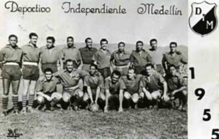 DEPORTIVO INDEPENDIENTE MEDELLIN 1955 CAMPEÓNARRIBA MISMO ORDEN: Calonga, Spada, Soria, Lauro Rodríguez, Caimán Sánchez, Retamozo, Canino Caicedo, Delatour, Hernández y Chema Méndez. ABAJO IZQ-DER: Larraz, Moreno, Arango, Sacco, SEGHINI, Marino, y Pacheco