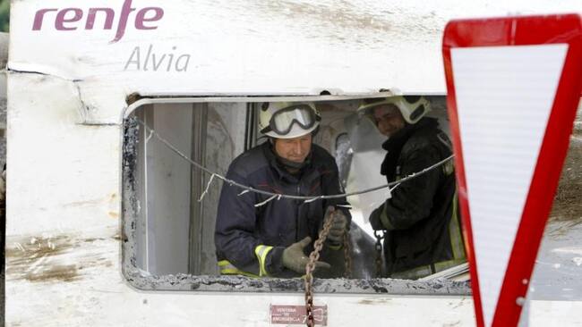 Foto 4 de 8Dos bomberos en el interior de uno de los vagones del tren Alvia procedente de Madrid, que descarriló a la altura de Santiago de Compostela causando decenas de muertos y más de cien heridos, durante las labores de retirada que se realizan. EFE/Salvador Sas