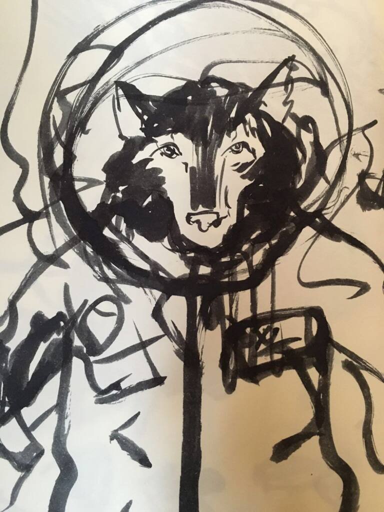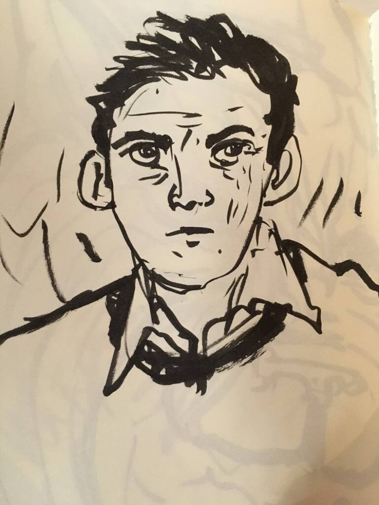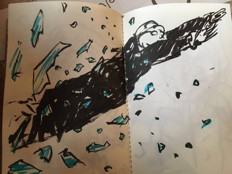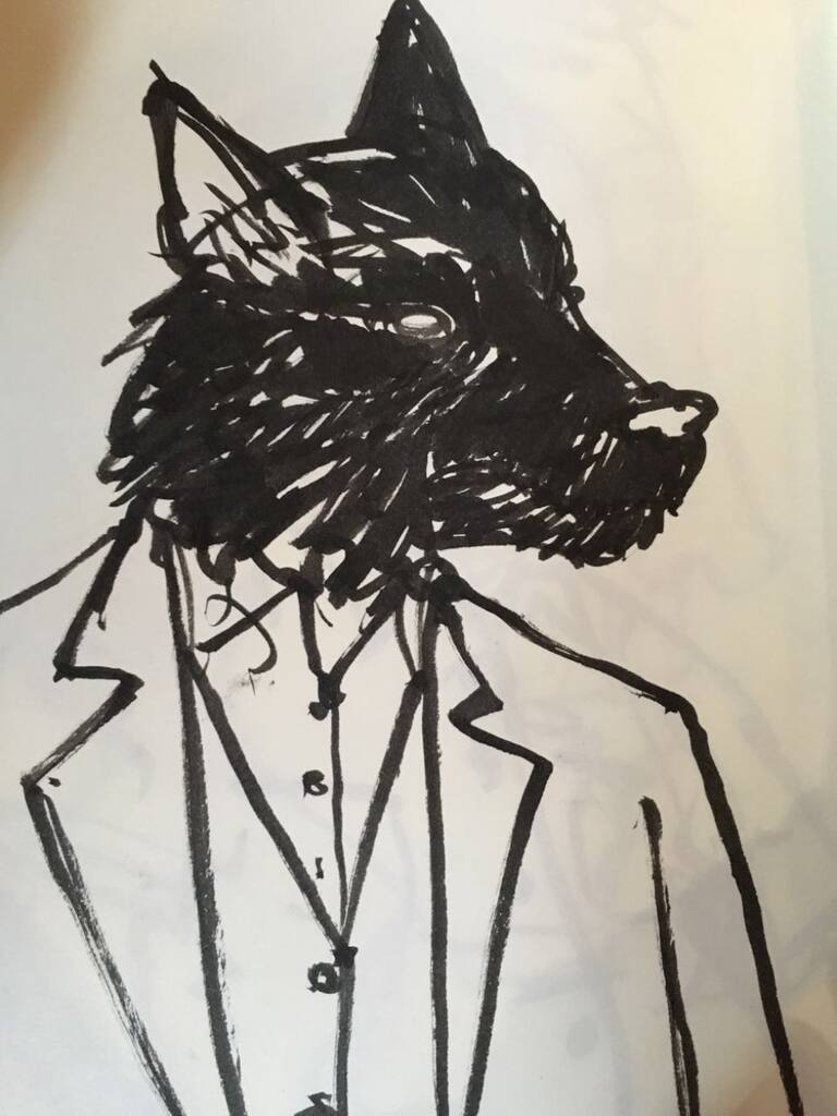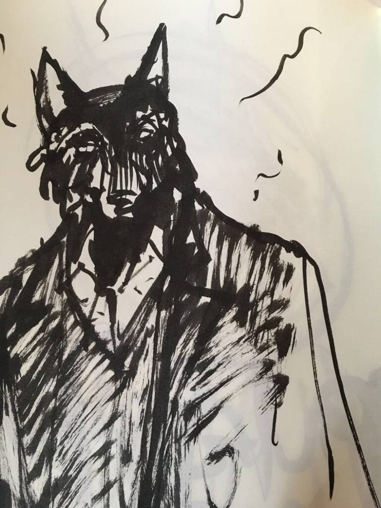 Esta nueva colección de dibujos juega con una mezcla de hombre/animal, entre otros retratos y un colorido árbol que une a Santiago de nuevo con lo natural.