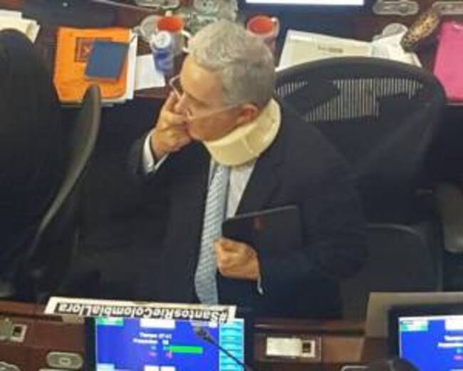 El senador Álvaro Uribe Vélez anda con cuello ortopédico. Así apareció ayer en el Congreso. Parece que en los últimos días ha tenido un dolor en el cuello y ¿saben por qué? por twittear tanto, afirmó este viernes Darcy Quinn en sus secretos de 6AM Hoy por Hoy, de Caracol Radio.