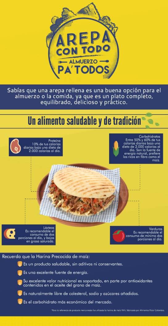 La arepa, en sus diferentes versiones, es típica de diversas regiones en Colombia, y la más reciente tendencia de consumo ha posicionado la arepa rellena como una nueva opción de almuerzos, equilibrada y deliciosa. “Al combinar la arepa con un relleno que contenga los diferentes grupos alimenticios que el cuerpo necesita, ésta se convierte en un plato práctico, delicioso y completo para el almuerzo. Para lograr este objetivo, se deben incluir siempre proteínas, lácteos y verduras, además del carbohidrato que ya esta representado por la harina precocida de maíz de la arepa”. puntualizó Patricia Vegas.
