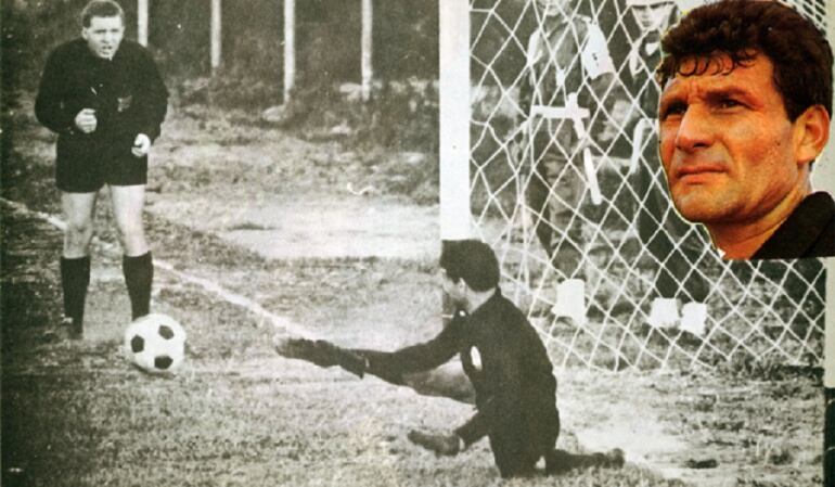 El arquero argentino del Deportes Quindío logró detener 8 penales en 1967. En la foto, el segundo penal de Areán. Había actuado en River Plate y en el fútbol español.