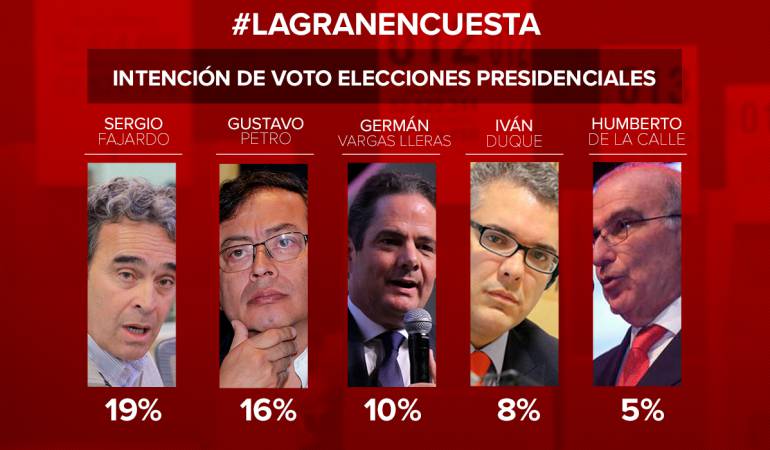Sergio Fajardo, 19%; Gustavo Petro, 16%; Germán Vargas Lleras, 10%; Iván Duque, 8%; Humberto de la Calle, 5%; Marta Lucía Ramírez, 5%.