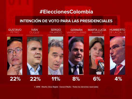 Por Gustavo Petro, 22%; por Iván Duque, 22%; por Sergio Fajardo, 11%; por Germán Vargas Lleras, 8%; por Marta Lucía Ramírez, 6%; por Humberto de la Calle, 4%; por Alejandro Ordóñez, 3%; por Vivian Morales, 2%; por Piedad Córdoba, 1%; por Juan Carlos Pinzón, 1%; por Rodrigo Londoño ‘Timochenko’, 1%; por Carlos Caicedo, 1%.