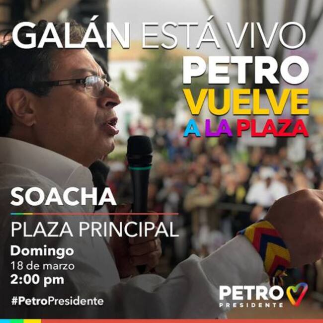 ‘Galán está vivo, Petro vuelve a la plaza’, dice la invitación a un acto del candidato presidencial a Soacha.