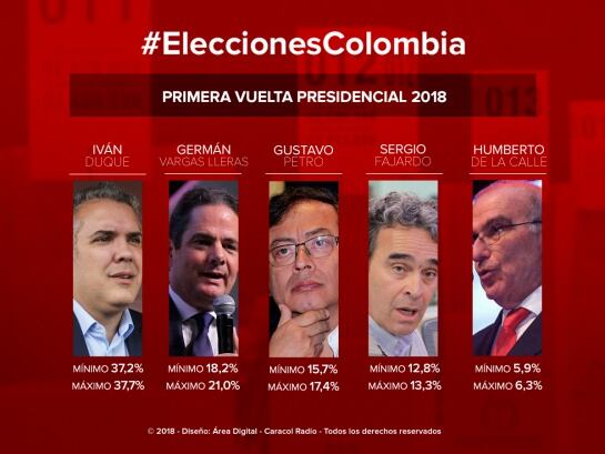 Y el candidato del Partido Liberal, Humberto de la Calle, registra un pronóstico de votación mínimo de 5,9% y máximo de 6,3%.
