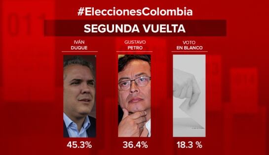 Si las elecciones fueran este fin de semana, Duque alcanzaría el 45,3% de los votos y Petro el 36,4%, mientras que la intención de voto en blanco se ubica en el 18,3%.