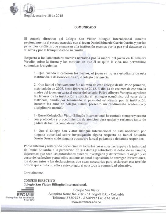 A través de un comunicado el consejo directivo del colegio San Viator Bilingüe internacional respondió a la denuncia que realizó Patricia Osorio, madre de Daniel Eduardo Osorio, el menor de edad que se habría suicidado a causa de un supuesto abuso sexual.