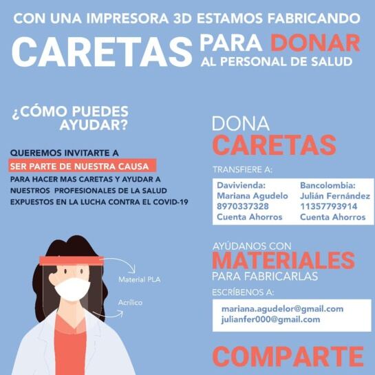 Mariana Agudelo y Julián Fernández iniciaron la ayuda humanitaria de imprimir caretas en 3D y donarlas todo el personal de salud que está expuesto en los hospitales.En este caso, no solo buscan ayudar a médicos y enfermeros sino al personal de aseo.