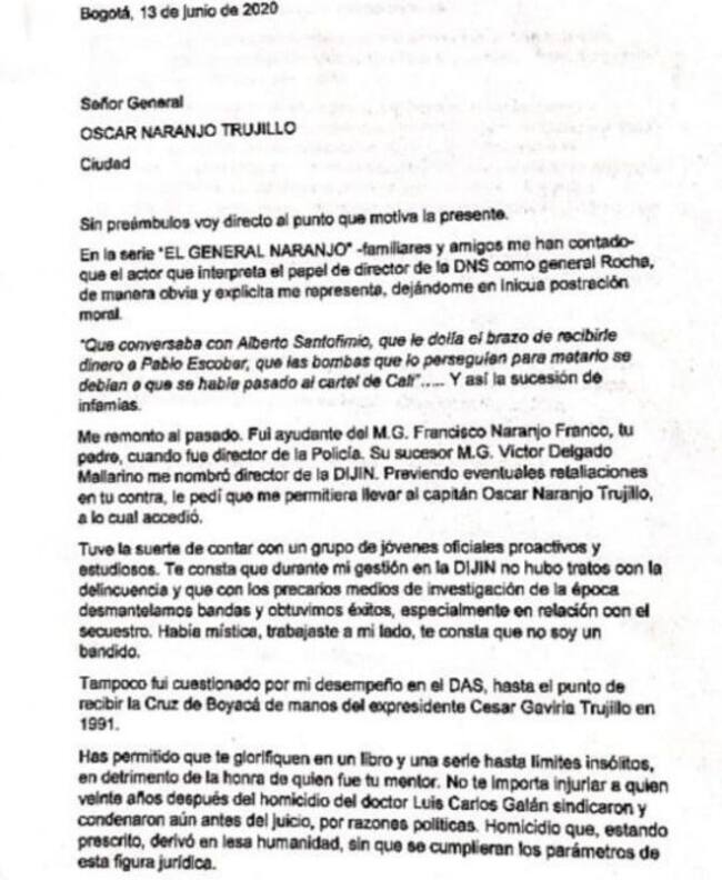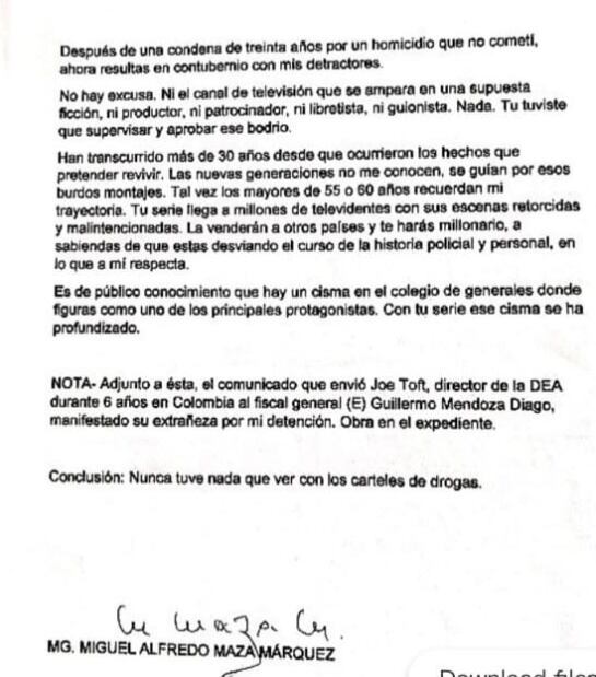 Entre tanto, circula una carta que Miguel Maza Márquez, le hizo llegar a Óscar Naranjo en la que le dijo que es bueno remontarse al pasado, porque las cosas no son tal cual se retratan en televisión: