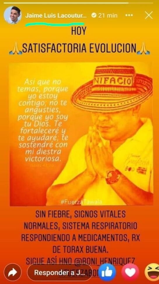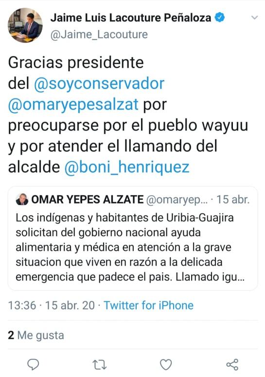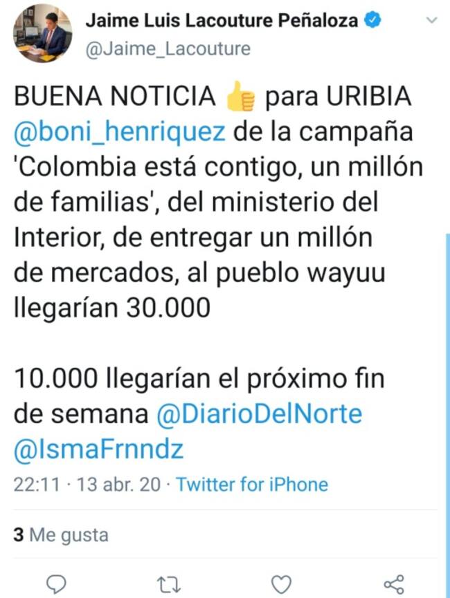 En el perfil del magistrado del Consejo Nacional Electoral, Jaime Luis Lacouture, aparece con un sombrero dando parte de tranquilidad sobre la salud del alcalde Uribía.