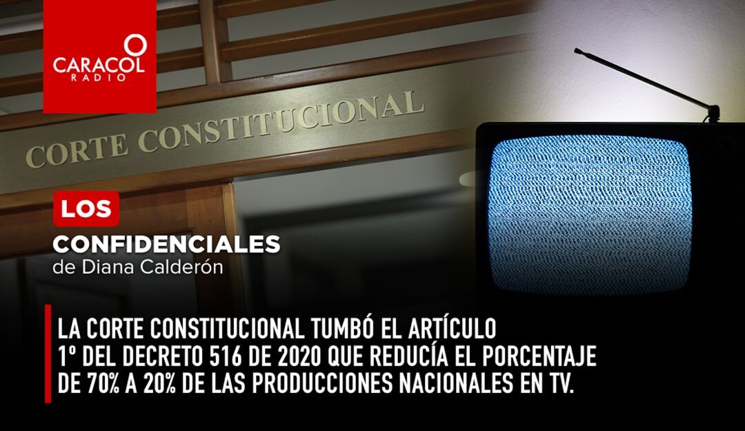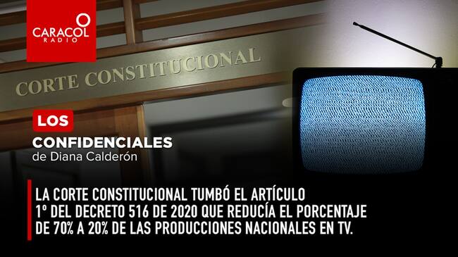 Fuentes de la Corte Constitucional confirmaron a Caracol Radio que en la Sala Plena se tumbó el artículo primero del decreto Ley 516 del 4 de abril de 2020, que reduce al 20 % el porcentaje mínimo para televisión abierta de producciones nacionales. Recordemos que desde hace décadas era del 70 % entre semana en las franjas de más audiencia y del 50 % los fines de semana, lo que generó el rechazo de actores y productoras nacionales.