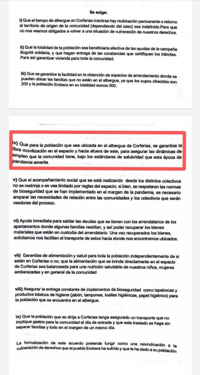 Una carta conocida por Caracol Radio de los pueblos Embera Katio y Embera Chamí que están en cambuches improvisados en el Parque Tercer Milenio y que enviaron a la Personería incluye varias exigencias para el Plan para reubicarlos en Corferias. Llama la atención que piden se les permita libre movilidad para que salgan de allí, pese al aislamiento preventivo, afirmando que tienen dinámicas de empleo. Lo anterior, pese a que los voceros de estas comunidades vienen denunciando que no tienen recursos para para subsistir.