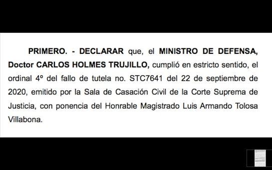 Caracol Radio conoció el fallo de tutela frente a una demanda por desacato por las disculpas públicas que debía presentar el ministro de Defensa, Carlos Holmes Trujillo por los excesos de la Fuerza Pública. El Tribunal Superior de Bogotá resolvió que el ministro ya cumplió. Declara que “el MINISTRO DE DEFENSA, Doctor CARLOS HOLMES TRUJILLO, cumplió en estricto sentido, el ordinal 4º del fallo de tutela no. STC7641 del 22 de septiembre de 2020, emitido por la Sala de Casación Civil de la Corte Suprema de Justicia”. Para esto se tomó en cuenta la Moción de Censura que se tramitó en la Cámara de Representantes el pasado 7 de octubre en la que dijo, “me permito reiterar que presento disculpas por los excesos de la Fuerza Pública, en especial aquellos cometidos por los Escuadrones Móviles Antidisturbios de la Policía Nacional – ESMAD-, durante las protestas desarrolladas en el país a partir del 21 de noviembre de 2019”.