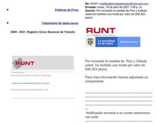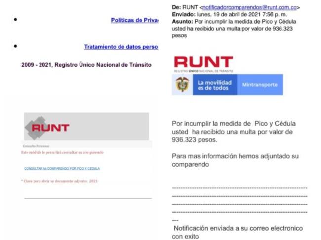 Las personas se confían porque el correo usa imágenes no autorizadas del Ministerio de Transporte y el RUNT y contiene un enlace que lo lleva a descargar un supuesto documento tipo PDF. Cuando DAN clic, lo que realmente está descargando es un malware en el computador, a través de este, le pueden robar datos financieros y personales.