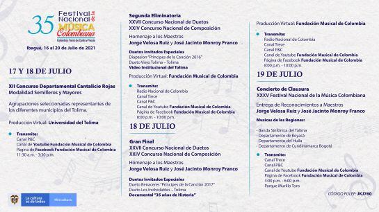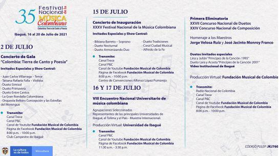 El XXXV Festival Nacional de la Música colombiana, se llevará a cabo del 15 al 20 de julio, para conectarse virtualmente y para enterarse diariamente de lo que acontece puede ingresar a: https://www.fundacionmusicaldecolombia.com/portal/