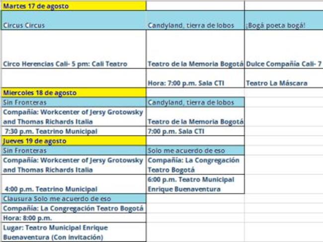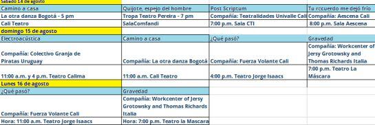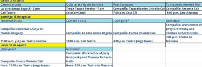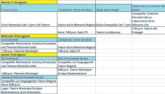El festival finaliza el 19 de agosto y cuenta con 17 días de teatro, cinco compañías internacionales, cinco nacionales y 25 locales; 70 funciones y 28 escenarios llenando la ciudad de vida con sus espectáculos de teatro, danza, performance, teatro infantil y familiar, música y teatro de calle. El festival además cuenta con una nutrida agenda académica.