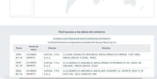 6AM de Caracol Radio encontró que esta es una empresa de 6 empleados, fundada en el 2016, con sede física en Coral Gables, en la Florida, pero que reporta sus ingresos en Delaware, conocido paraíso fiscal de Estados Unidos. La mayoría de sus registros comienzan entre el 2019 y el 2020. Por ejemplo, sus únicas exportaciones han sido a Colombia, casi todas por valores pequeños: 20 mil dólares. La empresa, Nuovo Security, envió al país cámaras desde China. El cliente fue VIRTUAL TICS SAS, con sede en Barranquilla. También conocimos el reporte financiero que la prestigiosa firma Dun & Bradstreet, una compañía dedicada a suministrar información sobre miles de compañías hizo de Nuovo Security.