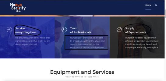 Tal vez lo más grosero es que los textos en la página están mal escritos. Hay errores de ortografía, como escribir mal la palabra "equipment" en inglés. Hay problemas de concordancia: en un texto, el sujeto está en singular y el verbo en plural. En resumen: todo lo que está escrito, está mal redactado y con mala ortografía.