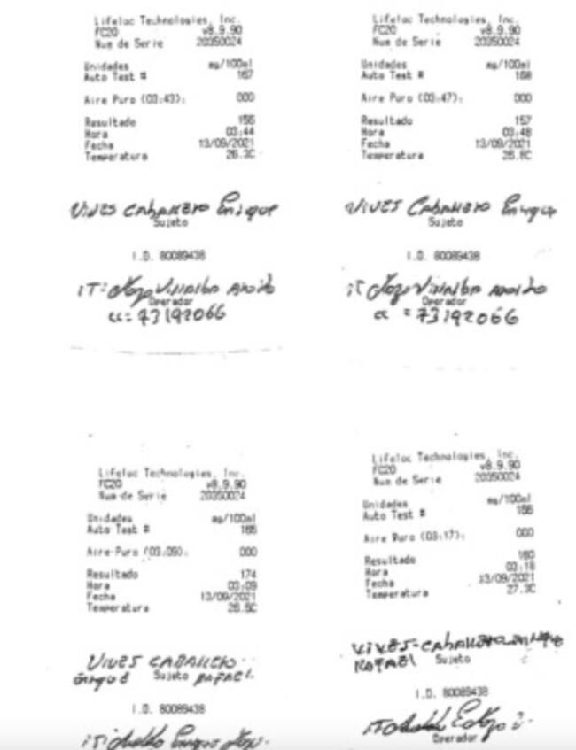 La primera que le hicieron, a las 3:08 am, marcó 174, qué es grado 3 de embriaguez. A las 3:16 am, 8 minutos después, le hacen una segunda prueba, y marca 160, que sigue siendo grado 3. Luego, a las 3:44 am y 3:48 am le hacen otras dos: marcan ambas por encima de 155, que sigue siendo grado 3.