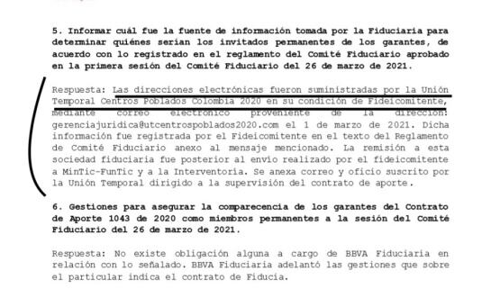 En el contrato de la fiducia, que suscribe Centros Poblados y la fiducia del banco BBVA, se establece en el parágrafo cuarto: "La compañía aseguradora y la entidad bancaria emisora de la garantía de cumplimiento serán invitadas permanentes al Comité. Podrán participar con un representante, con voz pero sin voto".