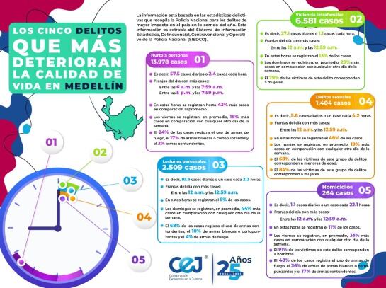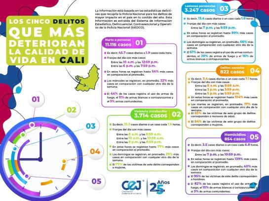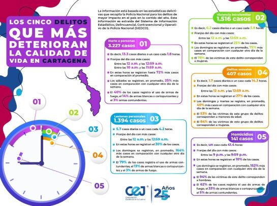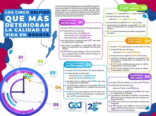 El documento expone las cifras de la comisión de cinco delitos: hurto, homicidio, lesiones personales, violencia intrafamiliar y delitos sexuales en Bogotá, Medellín, Cali, Barranquilla y Cartagena. De estas urbes, Bogotá se posiciona como el lugar con mayor percepción de inseguridad,