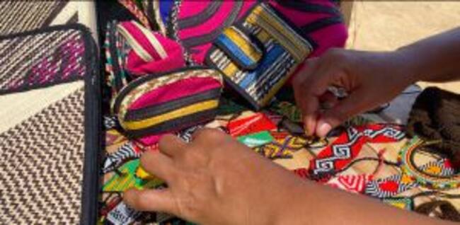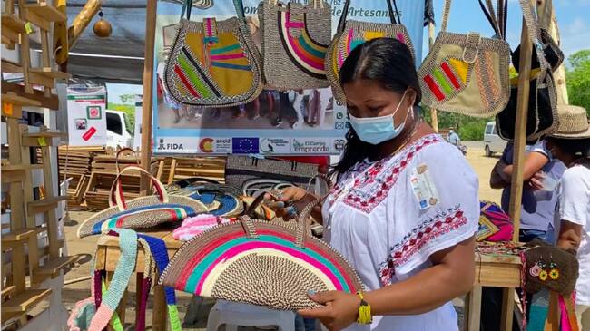 Señaló que la caña flecha que ellas trabajan es cultivada por sus familias en los resguardos de San Andrés de Sotavento y de Tuchín, en Córdoba, llevan la materia prima a Maria la Baja y allí tejen los sombreros y otras variadas artesanías como aretes, bolsos, carteras, billeteras, zapatos, bandejas y hasta prendas de vestir.
