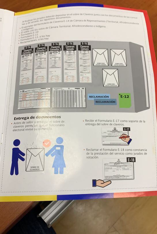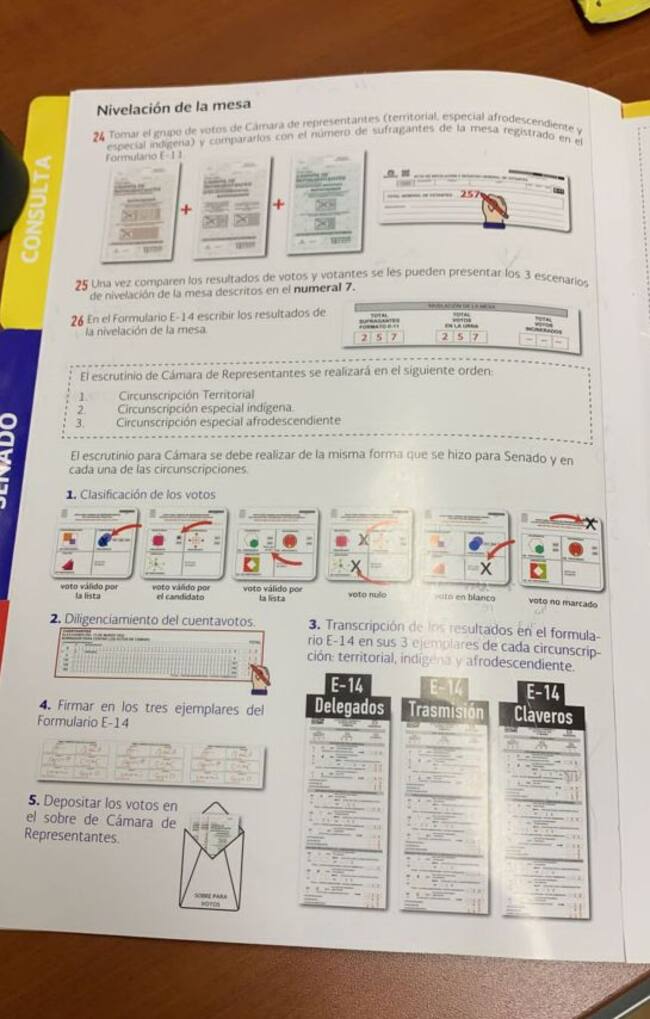 Caracol Radio tiene además las fotografías que se observan a continuación, con la cartilla “Instrucciones para Desarrollar su Labor como Jurado de Votación”, que se entregó con el Kit Electoral, donde no es claro ni se indica de manera precisa la manera en que se debían rellenar los cuadros en blanco en el formulario E-14.