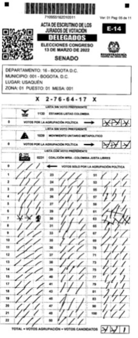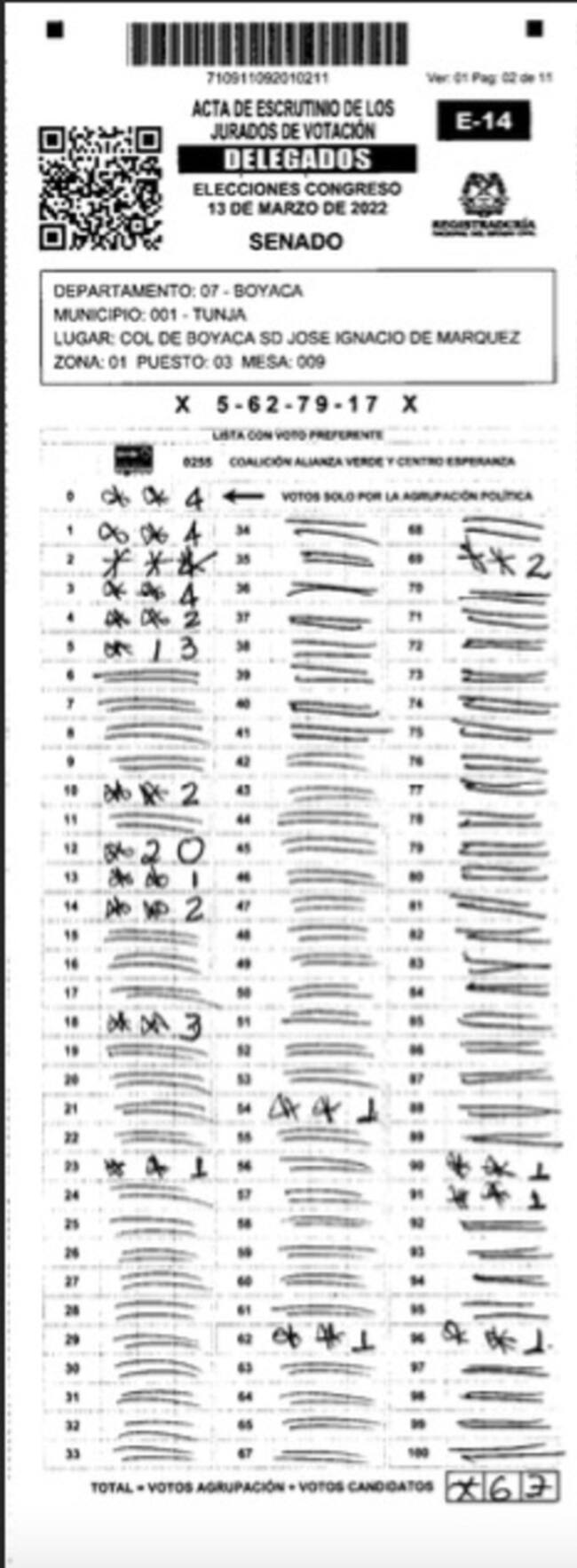 Según el informe del propio registrador Alexander Vega ante la Comisión Nacional de Garantías Electorales uno de los principales errores que se detectó entre el preconteo y el escrutinio fue el diligenciamiento de los formularios E-14, sin embargo, le adjudicó el error a los jurados, asegurando que las instrucciones fueron claras en la capacitación.