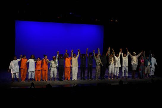 Desvelaciones, la obra está basada en la reconciliación, en el proceso de paz. son 102 artistas en escena en el escenario del Teatro Mayor Julio Mario Santo Domingo.