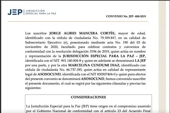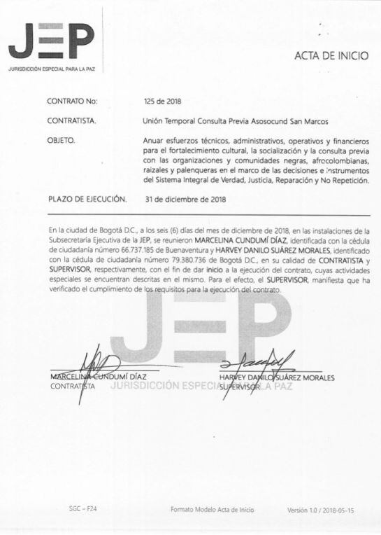 El 6 de diciembre de 2018 se firma el acta de inicio del contrato 125 de 2018. Tiene dos firmas: la de Harvey Danilo Suárez, como Supervisor y representando a la JEP, y la de Marcelina Cundumí Díaz, contratista y representante de la ASOCIACION AGROPECUARIA SONIA CUNDUMÍ DIAZ, ASOSOCUND. El valor del contrato es de casi 6 mil millones de pesos. La duda tiene que ver con el historial criminal de la señora Cundumí Díaz, relacionado con uno de los más grandes escándalos de corrupción del país: Foncolpuertos.