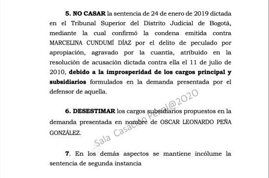 El caso penal contra Macerlina Cundumí, condenada en primera y segunda instancia por defraudar al Estado colombiano, llegó también a la Corte Suprema en el recurso de casación, que fue negado por la corte el 18 de noviembre de 2020, es decir, tres días antes de suscribir el segundo contrato. Según la versión de la JEP, solo se dio cuenta de la situación jurídica de la señora en abril de 2021, cuando leyó la decisión de la Corte Suprema de Justicia. La JEP, días después, la denunció ante la fiscalía por falsedad en documento público.