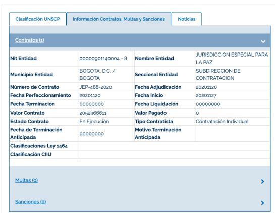 Luego, dice la JEP, cuando el Tribunal Superior de Bogotá ratifica la condena en 2019, los registros siguen sin aparecer en el Sistema de Información de Registro de Sanciones e inhabilidades (SIRI). Es decir: que ellos verificaron y no aparecía condena alguna. Hay un segundo contrato en la JEP que también involucra a la condenada Marcelina Cundumí Díaz. El 21 de noviembre de 2020, por cerca de 2 mil millones de pesos, se firma otro contrato con la Asociación Agropecuaria Sonia Cundumí Díaz. La JEP, igual que en el primer caso, se defiende diciendo que también verificaron en organismos de control y que las inhabilidades seguían sin aparecer. La verificación, que Caracol Radio 6AM pudo ver, tiene fecha de noviembre 20 de 2019, un día antes de suscribir el contrato.