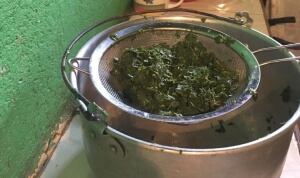 Hojas de la yuca en proceso para la cocción
