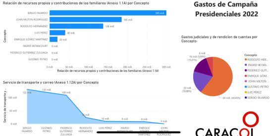 Detrás de Petro y Fajardo, está Rodolfo Hernández. El ingeniero ha gastado 1.731 millones de pesos, y ha recibido un total de 4.138 millones de pesos. En propaganda electoral, ha gastado 1.220 millones de pesos. Es el candidato que más ha gastado en temas judiciales y de rendición de cuentas, para este concepto ha destinado 64 millones de pesos.