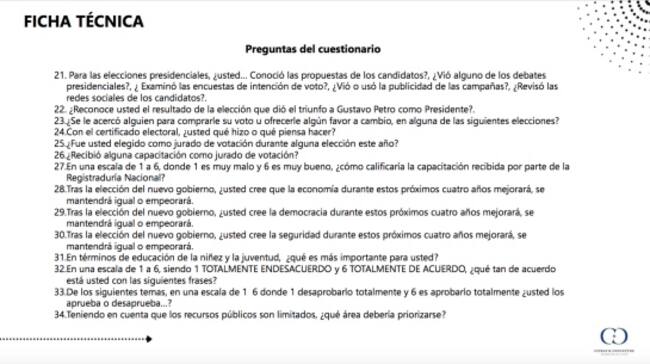 "Un 17% de las personas encuestadas, especialmente de derecha, no reconocen el resultado de las elecciones que dieron como ganador a Gustavo Petro", reiteró.