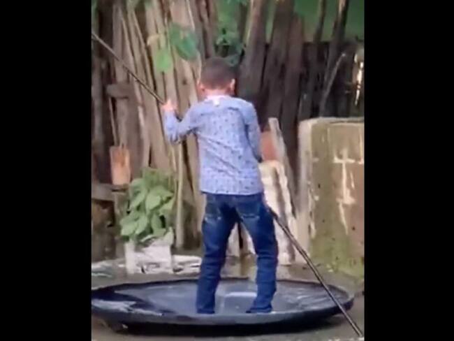 18 niños se montan en la tapa de un tanque, se quitan los zapatos y atraviesan una inundación para llegar a su escuela.