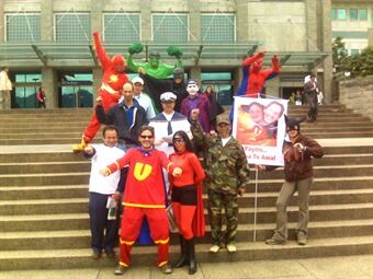 Disfrazados de superhéroes, padres de familia protestan por falsas denuncias en su contra