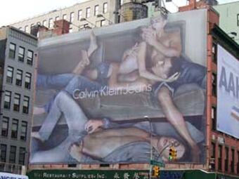 Una enorme valla publicitaria de la firma Calvin Klein que se ha instalado en el barrio neoyorquino del SoHo ha escandalizado a algunos ciudadanos de Nueva York por su elevado tono erótico, ya que muestra a cuatro jóvenes recostados en un sofá, con los torsos desnudos y besándose