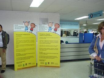 Adicionalmente en las pantallas de cada una de las bandas de equipaje del área internacional y nacional aparecen cada dos minutos mensajes que persuaden a los turistas sobre el tema