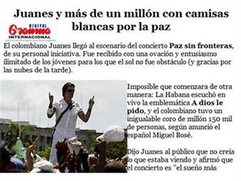 Texto del diario oficial de Cuba: Granma, tomado de su portal web www.granma.cuEl colombiano Juanes llegó al escenario del concierto Paz sin fronteras, de su personal iniciativa. Fue recibido con una ovación y entusiasmo ilimitado de los jóvenes para los que el sol no fue obstáculo (y gracias por las nubes de la tarde)