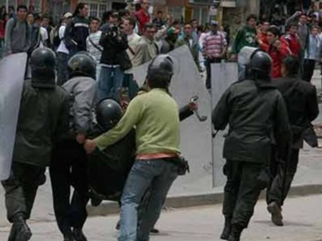 Quienes ocasionan los disturbios lanzaron botellas con combustible sobre una tanqueta, que alcanzó a prenderse y fue retirado del sitio
