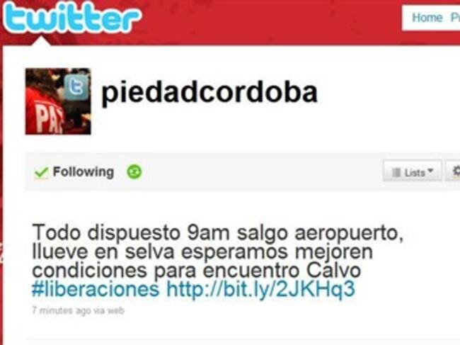 "Todo dispuesto 9am salgo aeropuerto, llueve en selva esperamos mejoren condiciones para encuentro Calvo" publicó a través de su pagina de Twitter la senadora Piedad Córdoba minutos antes del inicio de la operación humanitaria para recibir al soldado profesional Josué Daniel Calvo