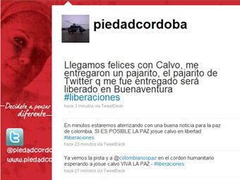 "Llegamos felices con Calvo, me entregaron un pajarito, el pajarito de Twitter q me fue entregado será liberado en Buenaventura #liberaciones", escribió Piedad Córdoba.