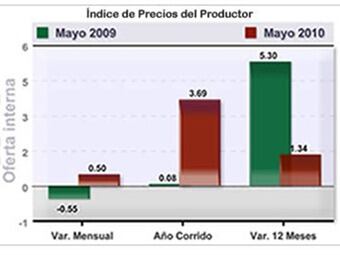 En lo corrido de 2010, la variación del Índice de Precios del Productor fue 3,69 por ciento. Esta tasa es superior en 3,61 puntos porcentuales a la registrada en mayo de 2009, cuando se ubicó en 0,08 por ciento.