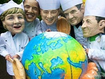 Disfrazados de líderes como la canciller alemana, Angela Merkel, el presidente francés, Nicolas Sarkozy, el primer ministro italiano, Silvio Berlusconi, y el presidente estadounidense, Barack Obama, los activistas escenificaron un partido de fútbol en Bonn (oeste de Alemania) con una gran planeta Tierra de plástico a modo de balón