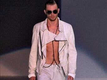 Con el lema "Emporio Armani para Gaga", la casa de modas hizo desfilar sobre la pasarela lombarda a un hombre de prendas oscuras y de corte militar, con tejidos del estilo de la lycra o el cuero que bien podrían frecuentar los locales más sórdidos de la noche de una gran ciudad